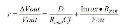 輸出電容器可減少負(fù)載紋波,幫助在負(fù)載瞬態(tài)期間提供穩(wěn)定的輸出電壓。當(dāng)考慮電容的ESR時,輸出電壓的紋波為: