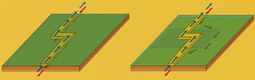 上圖為由于PCB參考地不完整造成的不可預(yù)期回流路徑增大環(huán)路面積