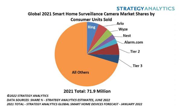 報告指出,截至 2021 年底,全球前五大家庭安防攝像頭品牌依次為:Ring、Arlo、Wyze、谷歌 Nest 和互動安防平臺提供商 Alarm.com。Strategy Analytics 估計,這五家公司的監(jiān)控攝像頭出貨量總計超過 1400 萬,約占 2021 年全球 7200 萬部安防攝像頭出貨量的 20%。