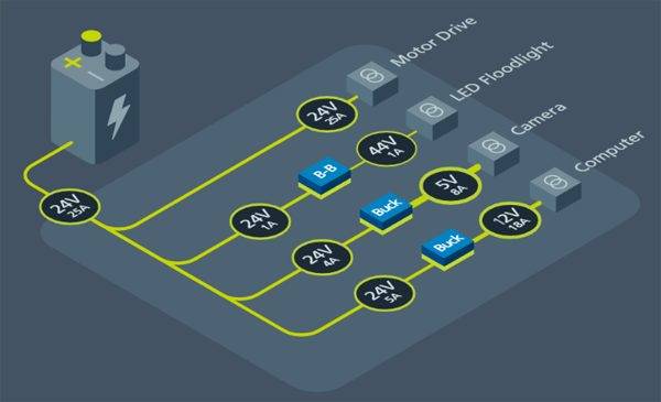 Dusty 的 FieldPrinter 是一款電池供電的移動機器人,可在各種氣象條件下長期工作。它包括大量不同的電子設(shè)備,包括傳感器、驅(qū)動電機和電動組件、計算量很大的處理器以及一款打印機等,所有這些設(shè)備都有不同的工作電壓及電流需求。