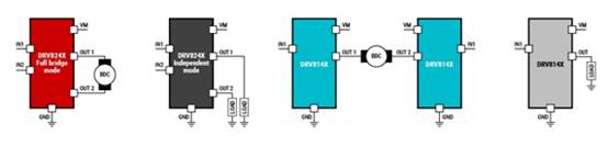 DRV8243-Q1 系列的H橋和半橋驅(qū)動(dòng)器支持設(shè)計(jì)重復(fù)使用,可在汽車系統(tǒng)中擴(kuò)展不同負(fù)載。該器件系列具有相似的固件、功能和封裝引腳排列,支持在各種負(fù)載和電流范圍內(nèi)重復(fù)使用,有助于縮短設(shè)計(jì)時(shí)間。用于獨(dú)立模式時(shí),H 橋驅(qū)動(dòng)器可驅(qū)動(dòng)兩個(gè)單向有刷直流電機(jī)、電磁閥或繼電器,無需兩個(gè)獨(dú)立半橋驅(qū)動(dòng)器;如圖3所示。