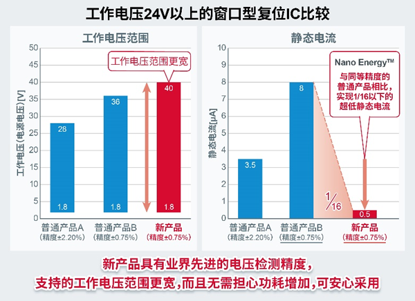 此外,通過搭載ROHM自有的超低靜態(tài)電流技術(shù)“Nano Energy™”,將靜態(tài)電流降至非常低的500nA(0.5µA,即同等功能和精度的普通產(chǎn)品的1/16),客戶采用該產(chǎn)品時,無需擔(dān)心電池驅(qū)動的車載應(yīng)用在引擎停止時的功耗增加,因此,該產(chǎn)品也適合用來在需要功能安全*2的車載和工業(yè)設(shè)備的各種電源電路中增加電壓監(jiān)控功能。