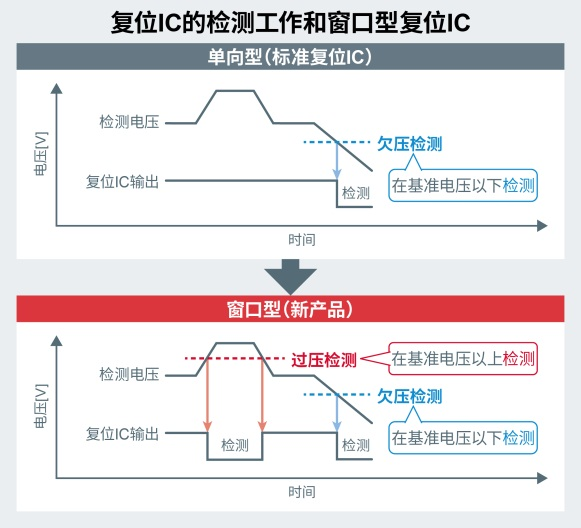 復(fù)位IC用于電子電路的電壓監(jiān)控,具有在超過閾值(即檢測電壓)時改變輸出的功能,因此具有通過與微控制器合作來確保系統(tǒng)安全的作用。標(biāo)準(zhǔn)的復(fù)位IC只能監(jiān)測單側(cè)(過壓或欠壓)電壓,被稱為“單向型”復(fù)位IC;而窗口型復(fù)位IC則可以監(jiān)測兩側(cè)的電壓,因此一個產(chǎn)品可以發(fā)揮兩種作用。