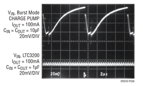 即使采用小型輸出電容器,器件的2MHz振蕩頻率也可允許低輸出紋波,圖2給出了LTC3200-5采用不同值的輸出電容器支持100mA負(fù)載電流時(shí)的輸出紋波情況。