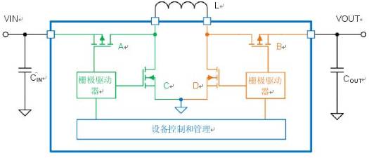 降壓-升壓轉(zhuǎn)換器將降壓轉(zhuǎn)換器(圖1中的綠色部分)與升壓轉(zhuǎn)換器(圖1中的橙色部分)合并在同一結(jié)構(gòu)中,從而可以有效地升高和降低輸出電壓?刂骗h(huán)路可以根據(jù)實(shí)際的輸入電壓和編程設(shè)定的輸出電壓來決定設(shè)備是否需要在降壓或升壓模式下運(yùn)行。