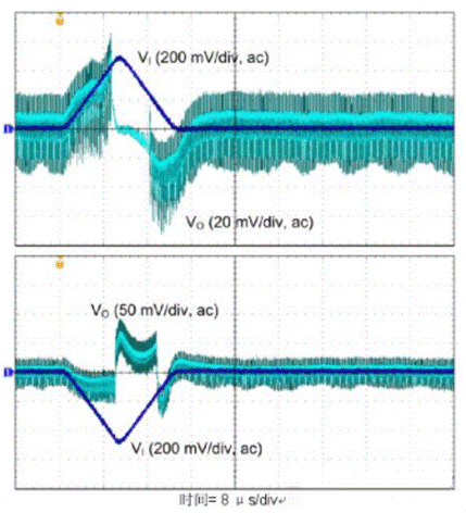 圖3:TPS63802在VI = VO = 3.3V, ΔVI = ±0.5V時的線路瞬態(tài)響應(yīng)