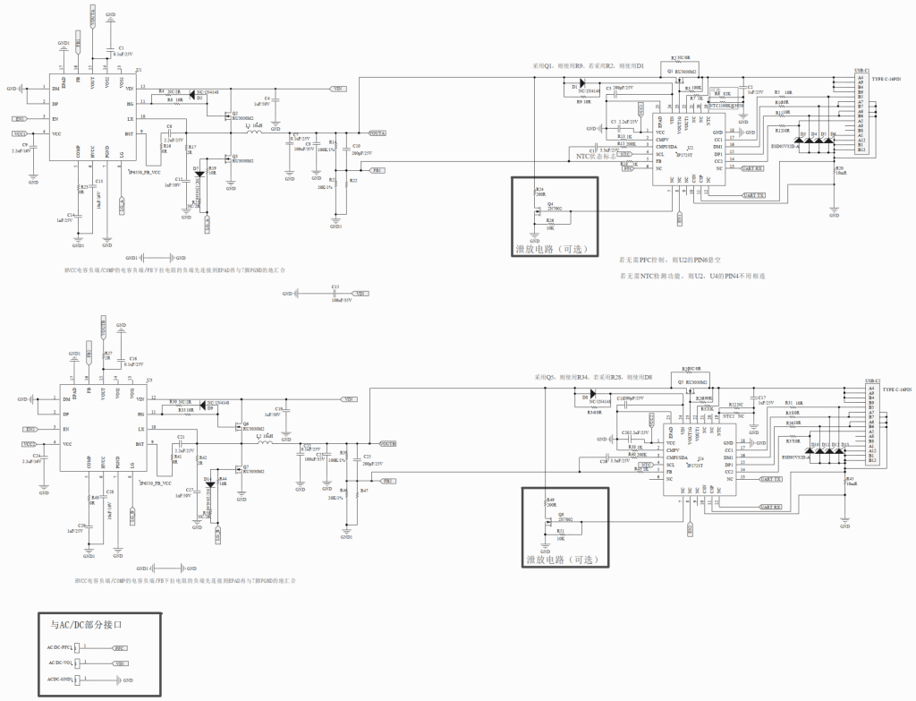 此款方案雙路均采用IP2723T搭配IP6550,通過(guò)雙路IP2723T之間的12/13腳進(jìn)行URAT通訊,來(lái)相互傳輸每個(gè)口的狀態(tài)信息,可以實(shí)現(xiàn)用C1口的IP2723T來(lái)控制PFC電路。
