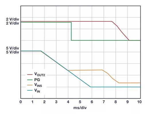 圖2. 當輸入電壓 VIN下降時,轉換器U1對 VOUT1 進行升壓以將 VINS維持在8 V。在 VINS降壓后,VIN 供電以使 VOUT2 保持穩(wěn)定超過20 ms。