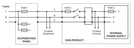 通過(guò)有線 AC 連接到機(jī)箱連接器的內(nèi)部電源必須在入口處包括合適的單保險(xiǎn)絲或雙保險(xiǎn)絲(視情況而定)。請(qǐng)記住,最終產(chǎn)品交流保險(xiǎn)絲保護(hù)上游電纜和連接,而不是內(nèi)部電源,以防止短路和過(guò)載。當(dāng)然,它必須通過(guò)正常運(yùn)行電流并留有一定的浪涌余量,但它也應(yīng)該在機(jī)箱連接器和電源之間對(duì)地短路后保險(xiǎn)絲斷開(kāi)之前進(jìn)行額定,以使連接到最終產(chǎn)品的外部交流電纜不會(huì)過(guò)載供應(yīng)。即使外部電纜的額定電流非常高,保險(xiǎn)絲的分?jǐn)嘀狄矐?yīng)低于任何上游保險(xiǎn)絲或斷路器,以避免導(dǎo)致多個(gè)電路斷開(kāi)的故障,即正確的保險(xiǎn)絲“協(xié)調(diào)” - 一個(gè)關(guān)鍵問(wèn)題在專業(yè)環(huán)境中(圖 2)。