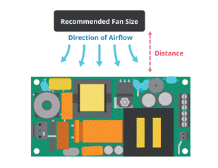 冷卻考慮很重要;內(nèi)部電源可以是風(fēng)扇、自然對(duì)流或底板冷卻,具體取決于最終產(chǎn)品及其應(yīng)用。在某些環(huán)境(例如醫(yī)療環(huán)境)中,出于噪音原因,或者在難以更換的應(yīng)用中,可能會(huì)排除風(fēng)扇,但風(fēng)扇冷卻電源通常會(huì)比其他類型的電源更小。如果選擇了風(fēng)扇冷卻供應(yīng),則必須仔細(xì)確定進(jìn)氣和排氣路徑以避免空氣“死角”,特別是如果有其他系統(tǒng)風(fēng)扇在運(yùn)行。CUI 等制造商在其產(chǎn)品的數(shù)據(jù)表中提供了推薦的氣流方向和風(fēng)扇尺寸;在將電源設(shè)計(jì)到系統(tǒng)中時(shí)應(yīng)考慮這些因素(圖 3)。
