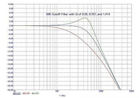 當(dāng)Q值為》 0.707時(shí),輸出濾波器將出現(xiàn)峰值,不同Q值下輸出濾波器的典型頻率響應(yīng)見下圖。