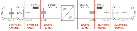 150kHz 至 300MHz 的寬帶干擾抑制,從而抑制傳導和輻射 EMC。如果輸入或輸出使用較短的電纜或不使用電纜,則可以降低濾波程度。圖 6
