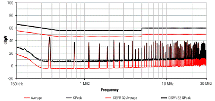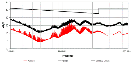 圖10:在輸入端帶濾波器的測量傳導發(fā)射。平均值和準峰值在整個測量范圍內(nèi)均低于限值。