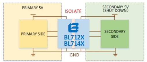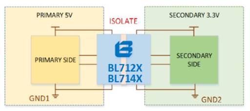 為了避免上述問題的發(fā)生,從圖3即可看出,使用BL712X/BL714X系列數(shù)字隔離器代替兩個電源域直接連接時,即可阻斷其間的泄漏電流。由于此時無需控制輸出狀態(tài),因此可簡化硬件和軟件的保護設計。