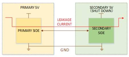 圖2原側開啟,而次級側關閉,該情況下會引起原側到次級側漏電;若要避免泄漏電流,則必須將數(shù)字線設為低電平輸出或高阻抗模式。