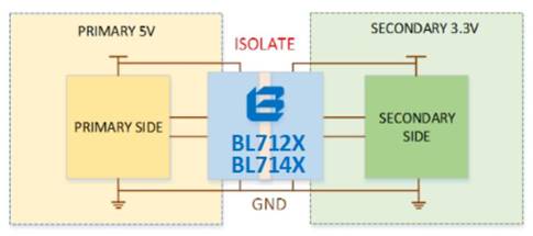 使用BL712X/BL714X系列數(shù)字隔離器在非隔離共地的情況下實現(xiàn)電平轉化,替代專用電平轉化芯片同樣可解決高側向低測漏電問題(圖4)。