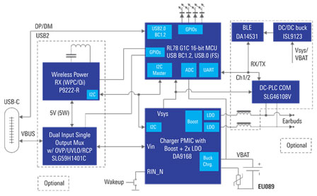 方案中使用的PMIC是瑞薩旗下可配置的單芯片電源管理IC DA9168,其集成的雙LDO和反向升壓功能,可支持USB On-The-Go(USB-OTG)標(biāo)準(zhǔn)。此外,該P(yáng)MIC芯片在非常緊湊的體積內(nèi)實(shí)現(xiàn)了極低的靜態(tài)電流消耗,這使其非常適用于眾多注重空間的、電池供電的消費(fèi)類(lèi)應(yīng)用。不僅如此,得益于DA9168的多種省電模式,使得產(chǎn)品無(wú)論是閑置存放還是在運(yùn)行中,都可以延長(zhǎng)電池壽命。在供電設(shè)計(jì)方面,方案可通過(guò)USB連接器或單芯片5W無(wú)線(xiàn)電源接收器(P9222-R)為該P(yáng)MIC供電。供電路徑由2:1電源多路復(fù)用器(SLG591401C)自動(dòng)選擇。