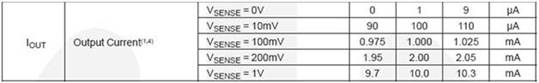 其中Vin為輸入電壓,Iout_fs的值則是表1中的對應值,在不同的最大Vsense時,其值不一樣。例如,若最大的Vsense為500mV時,則Iout_fs=5mA。