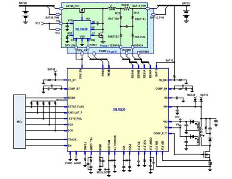 12 V 鉛酸電池,兩側(cè)是 48 V 鋰電池以啟動(dòng)發(fā)動(dòng)機(jī)。因此,需要根據(jù)整個(gè)系統(tǒng)的特定需求在兩個(gè)電池之間雙向傳輸電力。