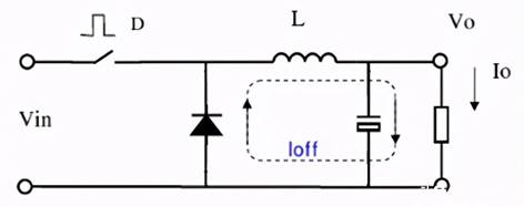 當(dāng)開關(guān)關(guān)斷時(shí):由于電感上的電流不能突變,電感中存儲(chǔ)的能量向負(fù)載釋放,電感電流通過二極管續(xù)流 ,在這個(gè)階段,電流波形是一條斜率為負(fù)的斜線。如下圖