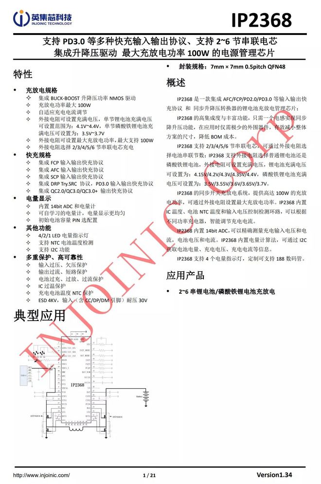 英集芯IP2368是一款內(nèi)置PD3.0快充協(xié)議,支持雙向輸入輸出,支持2-6串電池組充電,具備100W輸出功率的升降壓控制器。芯片內(nèi)部集成四管H橋驅(qū)動,集成協(xié)議功能,外圍電路精簡,應(yīng)用簡單。