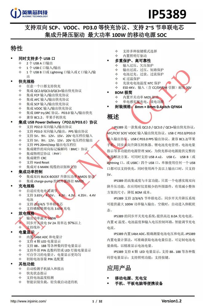 英集芯IP5389支持USB-A、USB-C口、還支持Micro-USB接口和Lightning接口供電輸入,全部接口支持快充?斐鋮f(xié)議支持華為FCP、SCP,支持三星AFC,支持OPPO的VOOC,支持PD3.0快充協(xié)議,支持PPS,輸出最高功率20V5A 100W,可實現(xiàn)全接口豐富的快充支持。