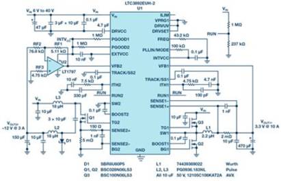 圖1. LTC3892的電氣原理圖,可產(chǎn)生正負(fù)電壓。VOUT1為10 A、3.3 V,VOUT2為3 A、-12 V。
