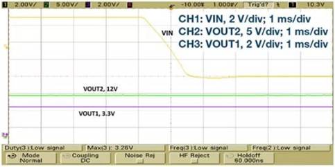 圖4. 軌電壓從14 V降至7 V,VOUT1和VOUT2均處于穩(wěn)壓狀態(tài)。