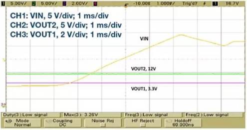 圖5. 軌電壓從14 V升至24 V,但VOUT1和VOUT2均處于穩(wěn)壓狀態(tài)。