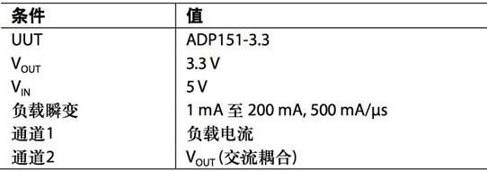因為LDO控制環(huán)路的帶寬有限,因此輸出電容必須提供快速瞬變所需的大多數(shù)負(fù)載電流。1μF電容無法持續(xù)很長時間供應(yīng)電流并產(chǎn)生約80mV的負(fù)載瞬變。10μF電容將負(fù)載瞬變降低至約70mV。將輸出電容提高至20μF,LDO控制回路就可捕捉并主動降低負(fù)載瞬變。測試條件如表1所示。