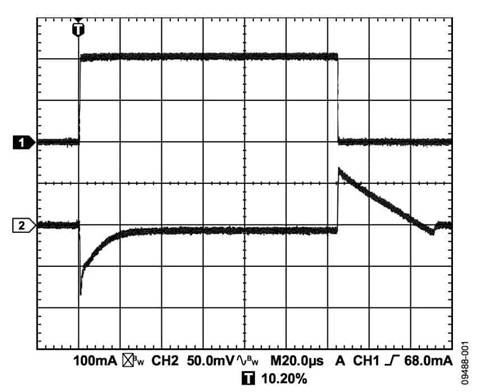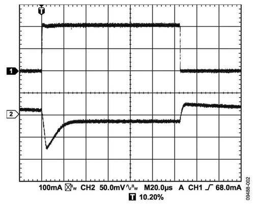 輸出電容還會影響負(fù)載電流變化的瞬態(tài)響應(yīng)。采用較大的輸出電容值可以改善LDO對大負(fù)載電流變化的瞬態(tài)響應(yīng)。圖1至3所示為輸出電容值分別為1μF、10μF和20μF的ADP151的瞬態(tài)響應(yīng)。