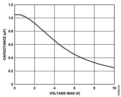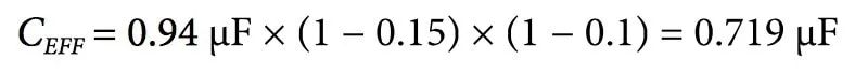 本例中,假定X5R電介質(zhì)在−40°C至+85°C范圍內(nèi)的最差情況電容(TVAR)為0.15(15%)。假設(shè)電容容差(TOL)為0.10(10%), CBIAS在1.8 V時為0.94μF,如圖4所示。