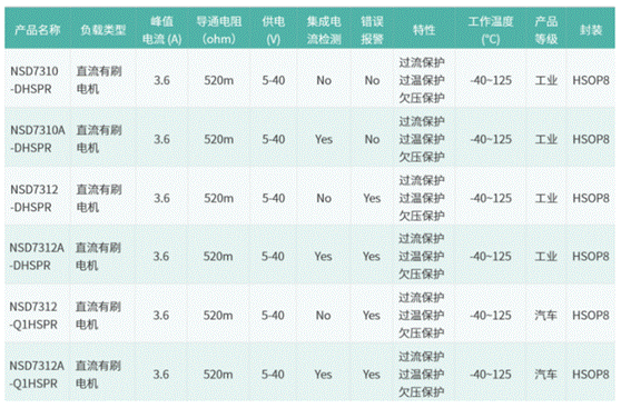 NSD7312/NSD7312A Q1可滿足電動(dòng)鎖止裝置對(duì)電機(jī)瞬態(tài)力矩與峰值電流的系統(tǒng)要求,可應(yīng)用于提供鎖止功能的車載電子控制器中,包括車載充電器(OBC),電池管理系統(tǒng)(BMS)或者車身控制系統(tǒng)(VCU)。