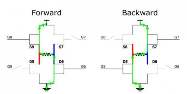 在 H 橋配置中,只有對角相對的 MOSFET 對被激活以控制方向,如下圖所示: