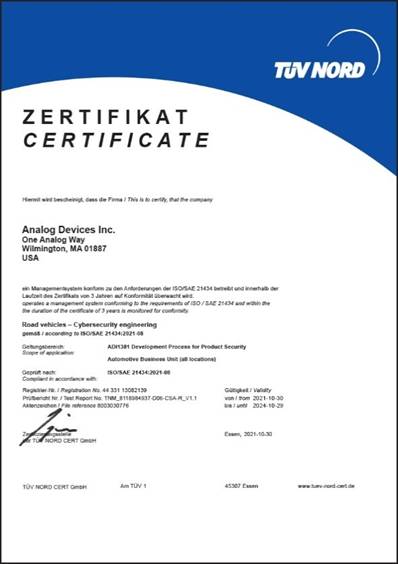 ADI的wBMS方法響應(yīng)了ISO/SAE 21434要求,實施了汽車行業(yè)安全產(chǎn)品開發(fā)所需的最高水平的檢查和嚴謹性。為此目的,ADI聘請了著名的可信認證實驗室TÜV-NORD來評估內(nèi)部開發(fā)策略和流程。經(jīng)過審查,ADI的策略和流程完全符合新標準ISO 21434,如圖4所示。
