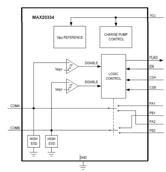 MAX20334是一款2xSPDT開(kāi)關(guān),具有過(guò)壓保護(hù)功能,適用于便攜式設(shè)備(圖3),該IC旨在保護(hù)下游數(shù)據(jù)線(xiàn)免受高壓短路、ESD或浪涌事件的影響。該設(shè)備具有便攜式電子設(shè)備中高性能開(kāi)關(guān)應(yīng)用所需的低導(dǎo)通電容和低導(dǎo)通電阻。該IC具有內(nèi)部正過(guò)壓和浪涌保護(hù)功能,可處理USB低/全/高速信號(hào),并采用2.7V至5.5V電源供電。該IC采用12引腳(1.23mm x 1.63mm)晶圓級(jí)封裝(WLP),可在-40°C至+85°C擴(kuò)展溫度范圍內(nèi)工作。