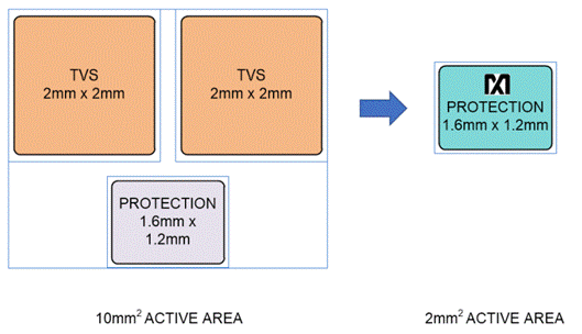 所有引腳均采用了ESD保護(hù)結(jié)構(gòu),以防止在處理和組裝過(guò)程中遭受高達(dá)±2kV(人體模型)的靜電放電。COMA和COMB(圖2和圖3)進(jìn)一步受到高達(dá)±15kV(人體模型)、±15kV(IEC 61000-4-2中描述的氣隙放電方法)和±8kV(IEC61000-4-2中描述的接觸放電方法)的ESD保護(hù),且不會(huì)造成損壞。ESD結(jié)構(gòu)在正常運(yùn)行和設(shè)備斷電時(shí)均可承受高ESD。在ESD事件之后,IC繼續(xù)工作,而不會(huì)發(fā)生閂鎖。該IC受到-30V至+45V(IEC61000-4-5)的浪涌保護(hù)和高達(dá)+20.5V的過(guò)壓保護(hù)。圖4將這種高度集成的擴(kuò)展保護(hù)解決方案的PCB布局與提供純正電涌保護(hù)及較低OV和ESD保護(hù)的典型競(jìng)爭(zhēng)產(chǎn)品進(jìn)行了比較。后者需要額外的電路來(lái)滿(mǎn)足ESD/浪涌/OV規(guī)范要求,增加了BOM成本, 并且PCB占用空間擴(kuò)增了5倍。