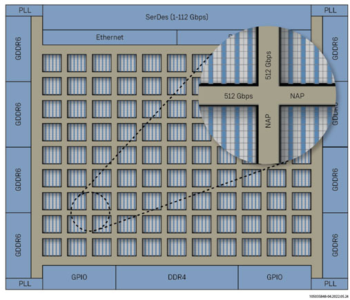 隨后這些數(shù)據(jù)進(jìn)入到Speedster7t的二維片上網(wǎng)絡(luò)(2D NoC)。該二維片上網(wǎng)絡(luò)是Speedster7t架構(gòu)中的另一種硬結(jié)構(gòu),時(shí)鐘頻率高達(dá)2 GHz,可與所有I/O、內(nèi)部硬模塊和FPGA邏輯陣列本身互連。憑借20 Tbps的總帶寬,2D NoC提供了最高的吞吐量,并通過適當(dāng)?shù)膶?shí)現(xiàn)方式,可以在外部GDDR6存儲(chǔ)器和支持MLP的計(jì)算引擎之間提供最具確定性的、低延遲的數(shù)據(jù)傳輸。