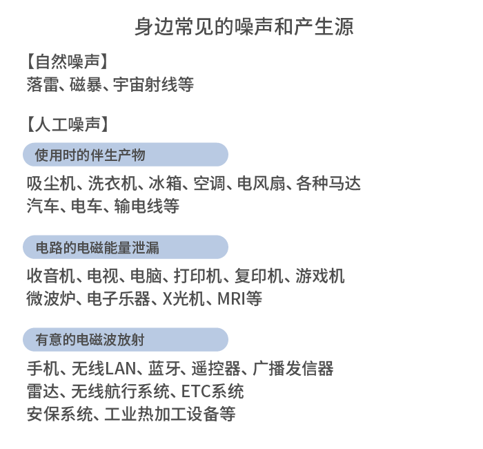 噪聲分為自然噪聲和人工噪聲。自然噪聲的產生源是落雷、空中放電、宇宙射線等。人工噪聲的產生源是電子設備。電子設備分為廣播發(fā)信器等有意發(fā)射電磁波的類型、收音機和電視等從內部泄漏電磁能量的類型,以及電動清掃機和工具等使用時會隨之產生電磁波的類型。