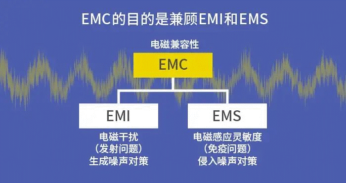 因此電子設備就同時需要具備防止自身產生噪聲的EMI (電磁干擾:Electro Magnetic Interference) 對策和防止自身受到影響的EMS (電磁敏感性: Electro Magnetic Susceptibility) 對策。這就叫做EMC (Electromagnetic Compatibility),即電磁兼容性。簡單來說,就是需要同時采取措施應對Emission (發(fā)射) 問題和Immunity (免疫) 問題,即應對生成噪聲和侵入噪聲,兼顧兩方面的方案就叫做EMC。