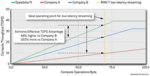 下圖顯示了一個有效TOPS的roofline模型,它使用了Achronix為微基準(zhǔn)(GEMV和MLP)和測試而構(gòu)建的子集,以及公司A [4] [5]和公司B(基于架構(gòu))發(fā)布的數(shù)據(jù)。橙色的豎線表示批處理量為8毫秒和80毫秒音頻模塊的最佳操作點,用于低延遲、實時ASR數(shù)據(jù)流應(yīng)用。在這個最佳操作點上,Achronix的有效TOPS比公司A提高了44%,比公司B的解決方案提高了260%。