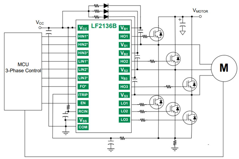 LF2136BTR是Littelfuse柵極驅(qū)動(dòng)器系列中的一款,除了LF2136BTR這種三相柵極驅(qū)動(dòng)器IC,還包括高壓高速柵極驅(qū)動(dòng)器,均具有高壓屬性,以及優(yōu)質(zhì)的驅(qū)動(dòng)特性、兼容特性和保護(hù)特性,并且都能夠在-40°C至+125°C的寬溫度范圍內(nèi)工作,可用于打造半橋柵極驅(qū)動(dòng)器、三相半橋柵極驅(qū)動(dòng)器和高側(cè)/低側(cè)柵極驅(qū)動(dòng)器。其中,半橋柵極驅(qū)動(dòng)器和高側(cè)/低側(cè)柵極驅(qū)動(dòng)器可經(jīng)過進(jìn)一步設(shè)計(jì)用于DC-DC轉(zhuǎn)換器、交流-直流逆變器電機(jī)控制、電機(jī)驅(qū)動(dòng)器、D類功率放大器等應(yīng)用;三相半橋柵極驅(qū)動(dòng)器則可以用于三相電機(jī)變頻器驅(qū)動(dòng)器、白色家電-空調(diào)、洗衣機(jī)、冰箱、工業(yè)電機(jī)逆變器-電動(dòng)工具、機(jī)器人,以及通用三相變頻器等。