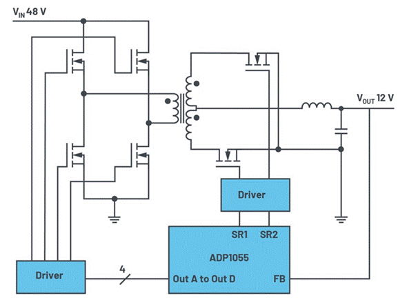 圖1. ADP1055數(shù)字開(kāi)關(guān)穩(wěn)壓器的全橋應(yīng)用。