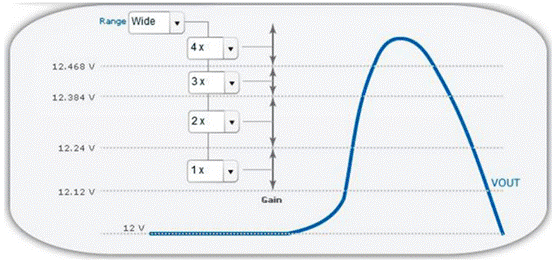 在圖3的示例中,設(shè)置的標(biāo)稱(chēng)輸出電壓為12 V?烧{(diào)控制環(huán)路增益可以設(shè)置為多個(gè)值,具體由輸出電壓決定。例如,如果因?yàn)?誤差放大器的增益增加,使得電壓升高至12.12 V以上,則可以在對(duì)應(yīng)的下拉菜單中設(shè)置控制環(huán)路。還有三個(gè)其他的電壓閾值高 于12.12 V,可以使用獨(dú)立的增益設(shè)置。注意,這些增益設(shè)置與在設(shè)計(jì)穩(wěn)壓環(huán)路時(shí)設(shè)置的極點(diǎn)和零點(diǎn)完全無(wú)關(guān)。