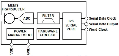 圖2是PDM輸出MEMS麥克風(fēng)的功能框圖,圖3是典型的I2S輸出數(shù)字麥克風(fēng)。I2S麥克風(fēng)包含PDM麥克風(fēng)中的所有,還包含抽取濾波器和串口。