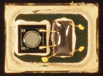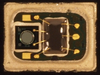 圖4和圖5分別顯示了模擬和數(shù)字MEMS麥克風(fēng)的內(nèi)部細(xì)節(jié)。在這些圖片中,你可以看到左邊的換能器和右邊的ASIC(在環(huán)氧樹脂底下),兩者都安裝在疊層上。數(shù)字麥克風(fēng)有額外的綁定線將來自ASIC的電氣信號連接到疊層。