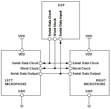I2S麥克風(fēng)可以直接連接具有這種標(biāo)準(zhǔn)接口的DSP或(圖8)。與PDM麥克風(fēng)一樣,兩個I2S麥克風(fēng)可以連接到一條公共的數(shù)據(jù)線上,不過與PDM不同的是,I2S格式使用兩個時鐘信號——一個字時鐘和一個位時鐘。
