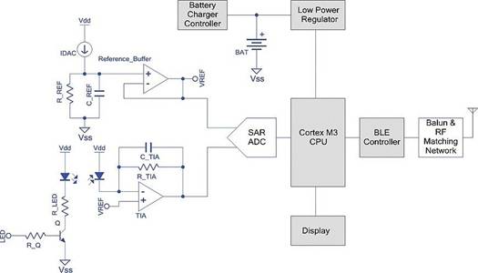 圖 2:腕帶光學(xué)心率監(jiān)測(cè)器的框圖。