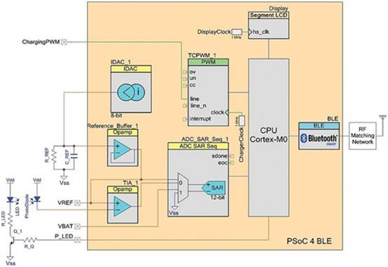 圖 3:使用 PSoC 4 BLE 片上系統(tǒng)的腕帶光學(xué)心率監(jiān)測(cè)器的框圖。