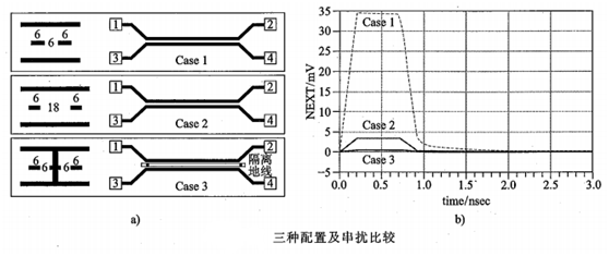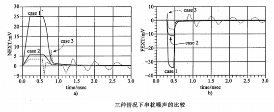 下圖顯示了三種情況下串?dāng)_波形,無(wú)論是近端串?dāng)_還是遠(yuǎn)端串?dāng)_,走線(xiàn)間距從1w增加到3w時(shí),串?dāng)_都明顯減小。在此基礎(chǔ)上,走線(xiàn)間插入保護(hù)地線(xiàn),串?dāng)_如下圖中Case 3所示,相比Case 2,插入保護(hù)地線(xiàn),不但沒(méi)有起到進(jìn)一步減小串?dāng)_的作用,反而增大了串?dāng)_噪聲。